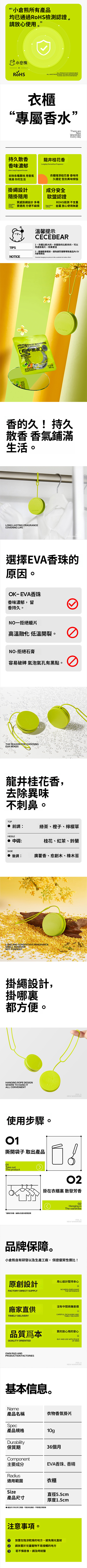 持久散香,香氣濃郁:有效去除各種異味,讓香氣充滿你的生活。龍井桂花香:為衣櫃增添桂花香氣,香味持久穩定,告別異味煩惱。掛繩設計,隨掛隨用:採用質感掛繩設計,適用於多個場景,方便唔麻煩。成分安全,獲歐盟認證:通過ROHS檢測,不含重金屬,讓你放心使用。