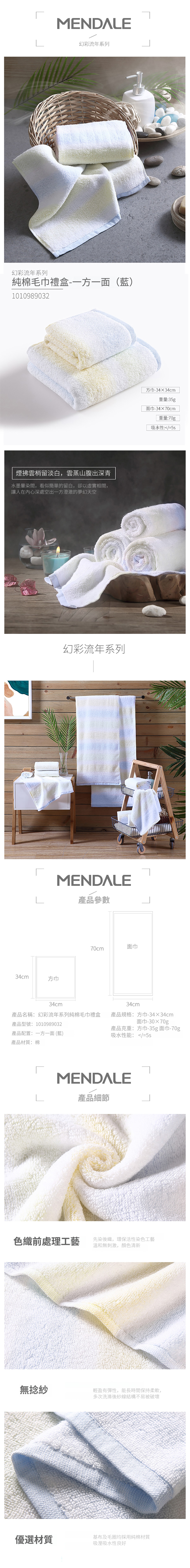 產品名稱:幻彩流年系列純棉毛巾禮盒產品產品型號:1010989032產品配置:一方一面(藍)產品材質:棉方巾:34x34cm 重量:35g面巾:34x70cm 重量:70g 吸水性:</=5S