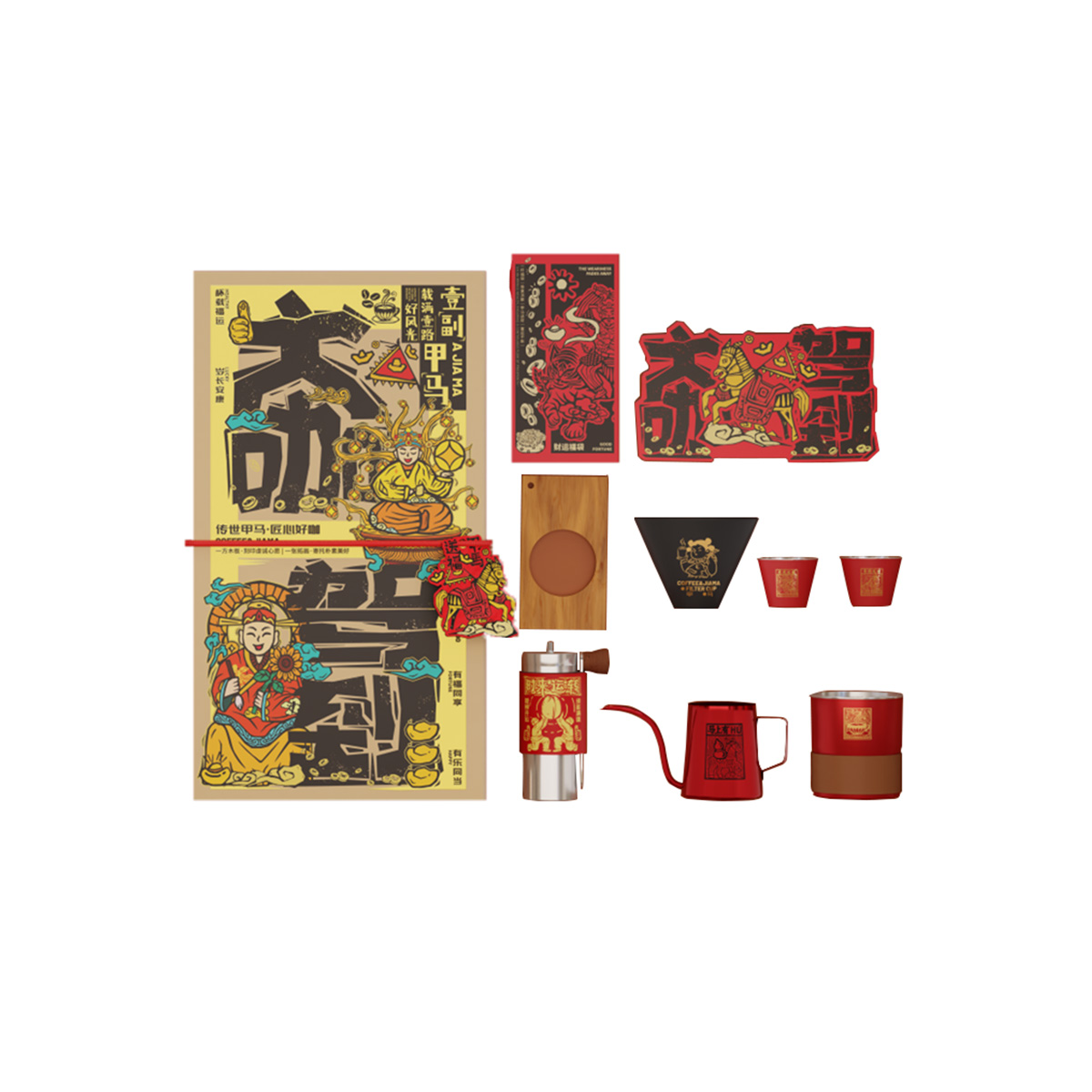 圍繞“木刻傳情,咖啡傳意”展開,創造性地將甲馬圖騰與手沖咖啡器具進行一體化設計。每一件咖啡器具都對應一個甲馬吉祥主題與功能祝福,例如“時來運轉”磨豆器、“提壺灌頂”手沖壺等,使沖泡咖啡的每一步操作都轉化為一種承載祝福的儀式。外包裝仿製木板年畫,搭配可取下作隨身守護符的毛氈甲馬掛件,實現了從包裝到產品的全方位文化敘事與沉浸式體驗。