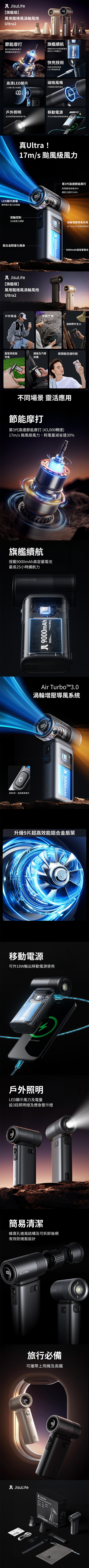 節能摩打:第3代高速節能摩打,耗電量減省達30%旗艦續航:搭載9000mAh高容量電池,最長25小時續航力快充技術:支援18W閃充技術,2.5小時急速充滿高清LED顯示:LED顯示風力及電量磁吸風嘴:升級磁吸式配件組合戶外照明:設3段照明燈及應急警示燈移動電源:可作18W輸出移動電源使用簡易清潔:蜂窩孔進風結構及可拆卸後網,有效防捲髪設計