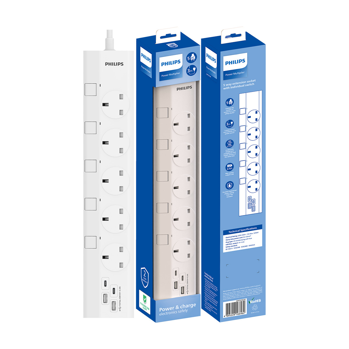 採用 5 個AC接地插座,讓您在一個 AC 插座插入多部電器裝置。每個 AC 插座獨立開關附設指示燈。配備2個USB-A、2個USB-C標準速度總輸出高達5V⎓2.4A,適用於電話充電及小型家電取電使用。總長度達3米線長並配備保險絲,適合商用家用環境。產品採用阻燃材質V0級耐火外殼,符合抵受750°C。符合國際安全標準BS1363/A。符合香港機電署安全標準。