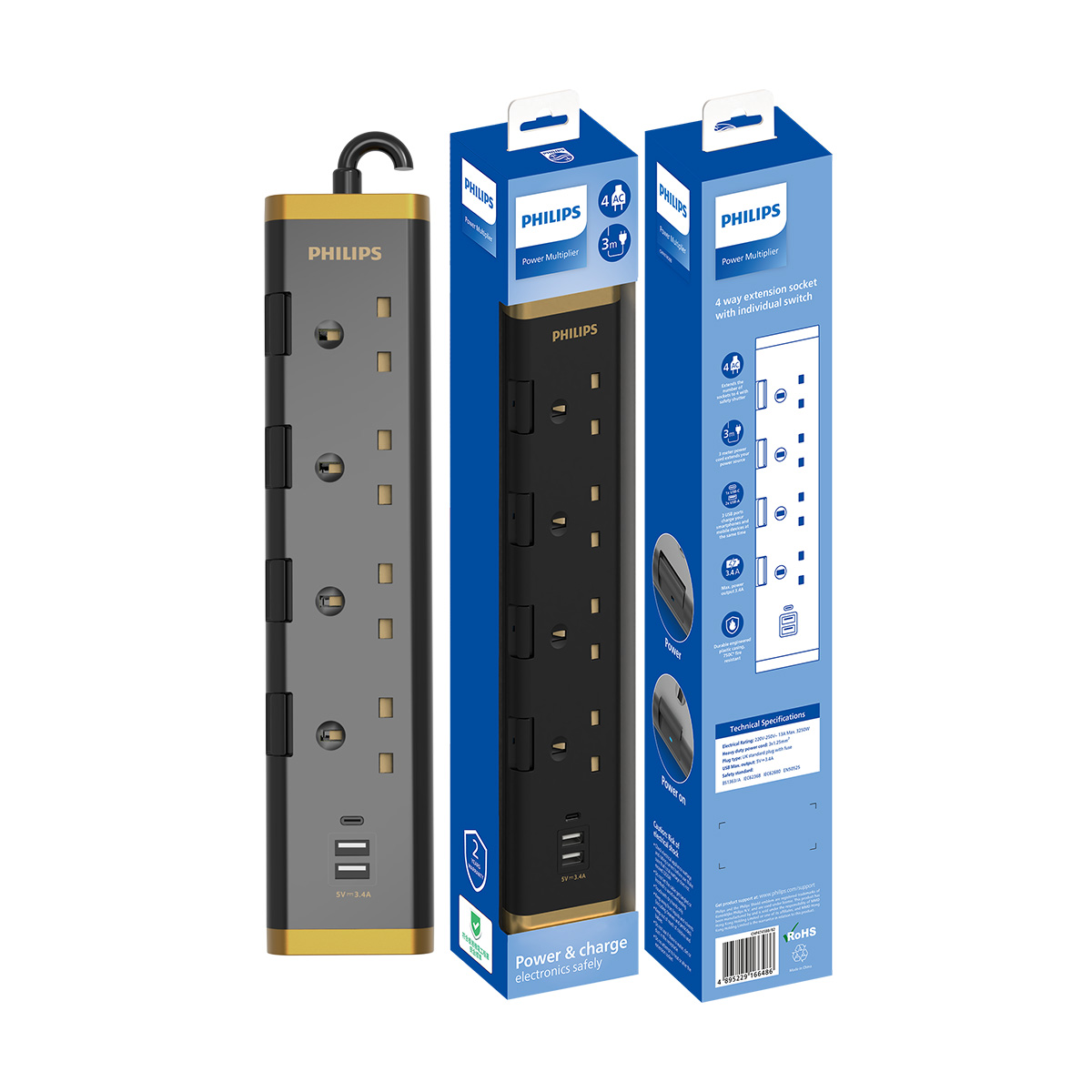 飛利浦電拖板創新獨立開關採用全新設計,扁平按鍵減低使用者誤觸機會。採用 4 個AC接地插座,讓您在一個 AC 插座插入多部電器裝置。每個 AC 插座獨立開關附設指示燈。配備1個USB-A、2個USB-C標準速度總輸出高達5V⎓3.4A,適用於電話充電及小型家電取電使用。總長度達3米線長並配備保險絲。產品採用阻燃材質V0級耐火外殼,符合抵受750°C。符合國際安全標準BS1363/A。符合香港機電署安全標準。