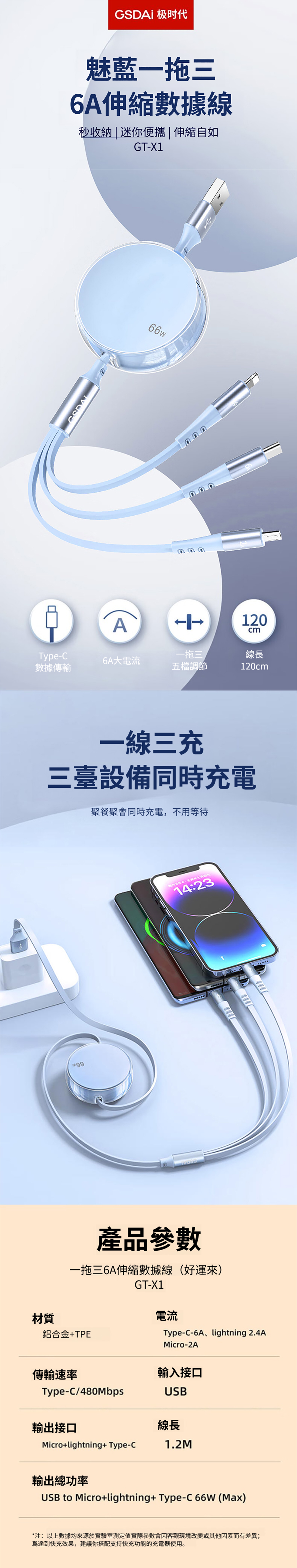 材質:鋁合金 + TPE電流:Type-C 6A、Lightning 2.4A、Micro USB 2A傳輸速率:Type-C / 480Mbps輸入接口:USB輸出接口:Micro USB + Lightning + Type-C線長:1.2米總輸出功率:66W (Max)